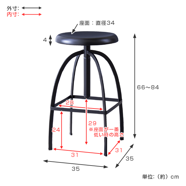| サイズ | 約 幅35×奥行35×高さ66〜84(cm) 座面:直径34(cm) |