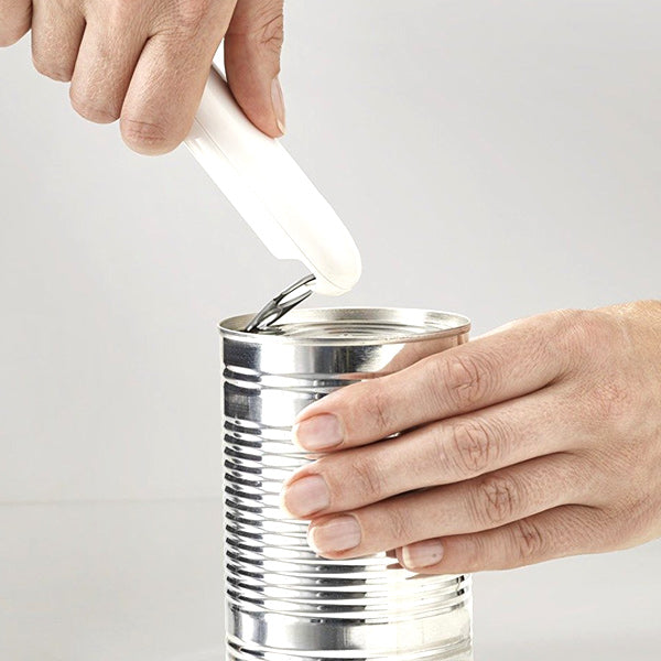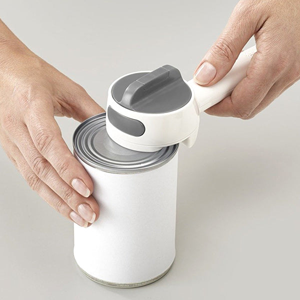 ●缶にセットして上部をくるくると回すだけで簡単に缶のフタを開けられる缶切りです。