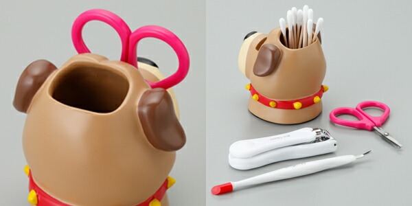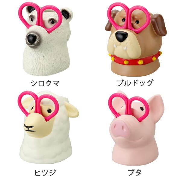 かわいいデザインだけでなく、綿棒や爪切りといった身だしなみ用品を収納していただけます。ハサミが付属しており、本体にセットしていただくと、動物たちがメガネをかけたようになります。