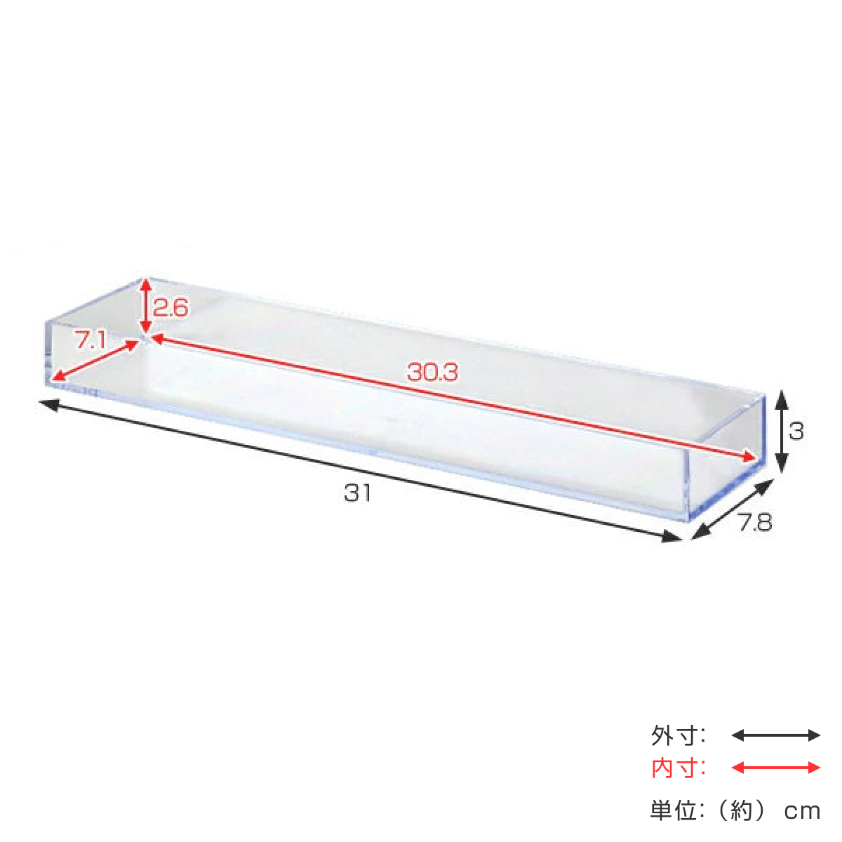 | サイズ | 外寸:約 幅31×奥行7.8×高さ3(cm) 内寸:約 幅30.3×奥行7.1×高さ2.6(cm) |