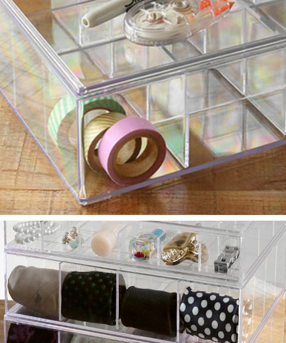 透明フタ付きで気になるホコリから収納物を守ります。浅い溝があるため、フタの上に物を乗せることも可能です。