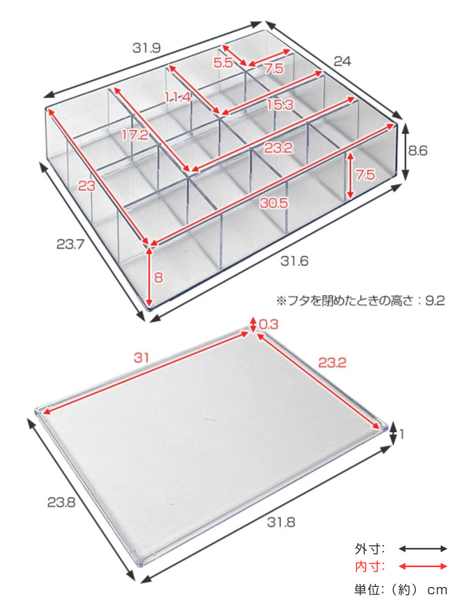 | サイズ | 約 幅31.9×奥行24×高さ9.2(cm) 仕切り一つ分の内寸:約 幅7.5×奥行5.5×高さ7.5(cm) 仕切りを全て外した内寸:約 幅30.5×奥行23×高さ8(cm) |
