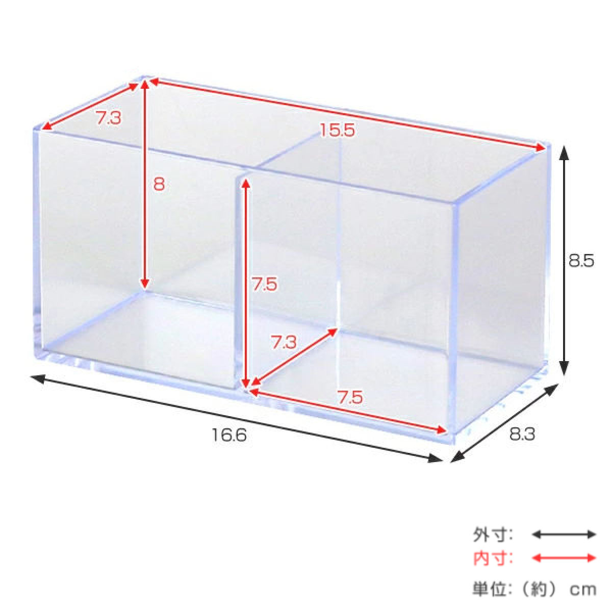 | サイズ | 外寸:約 幅16.6×奥行8.3×高さ8.5(cm) 内寸:約 幅15.5×奥行7.3×高さ8(cm) 一区切り分:約 幅7.5×奥行7.5×高さ7.5(cm) |