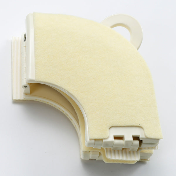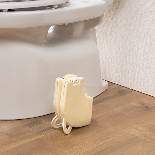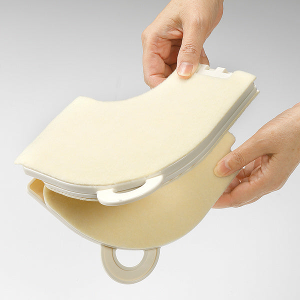 補助便座は4つに折りたたむことができ、たたんだ後はスペースを取らずにトイレ横などに立てて収納できます。便座のシートをはがさなくても折りたためます。