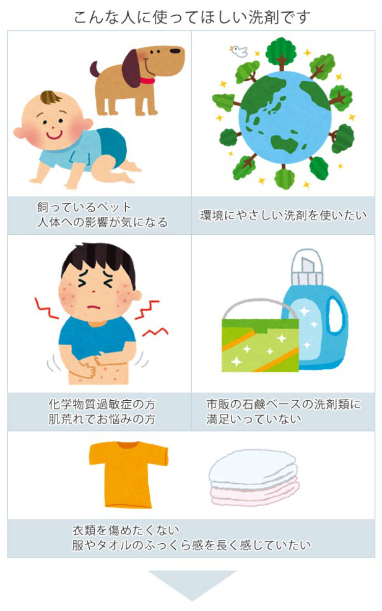 ふんわり仕上がるリンス剤(別売) 石けんで衣類を洗うと、どうしても黄ばみが発生しやすくなったり、白っぽい石けんカスが衣類に付着することがあります。別売りの衣類のリンス剤と合わせてお使い頂くと、石鹸かすをきれいに取り除き、洗い上がりの風合いが一段と良くなります。 |