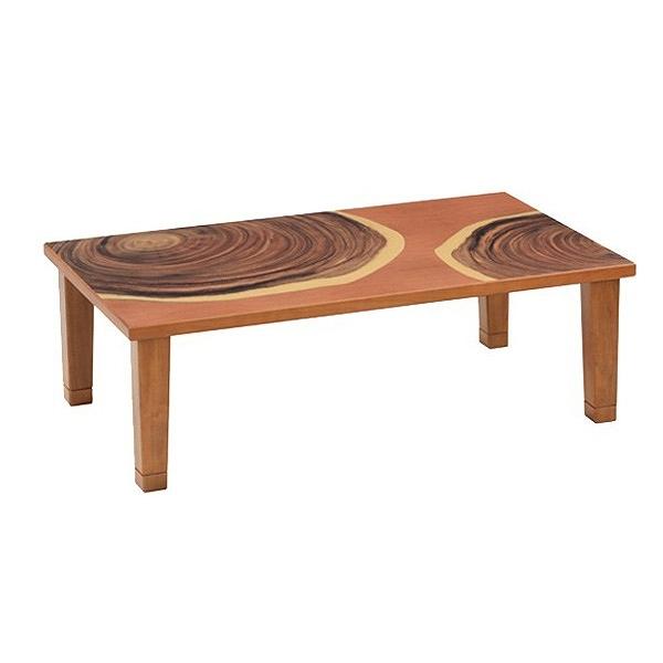 本物のようなリアルな質感高い転写技術でまるで本物のような木目を楽しめるこたつテーブルです。普通のプリントとは違いMDFに直に印刷することでより素材の持つ天然の風合いを感じられます。年輪風の模様が美しくお部屋のアクセントになります。天板幅が120cmタイプです。4cmの継ぎ脚が付いているので高さを2段階に調節して頂けます。