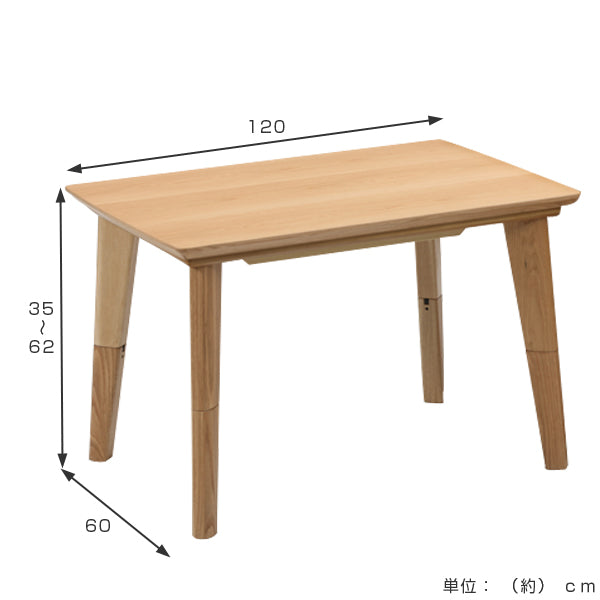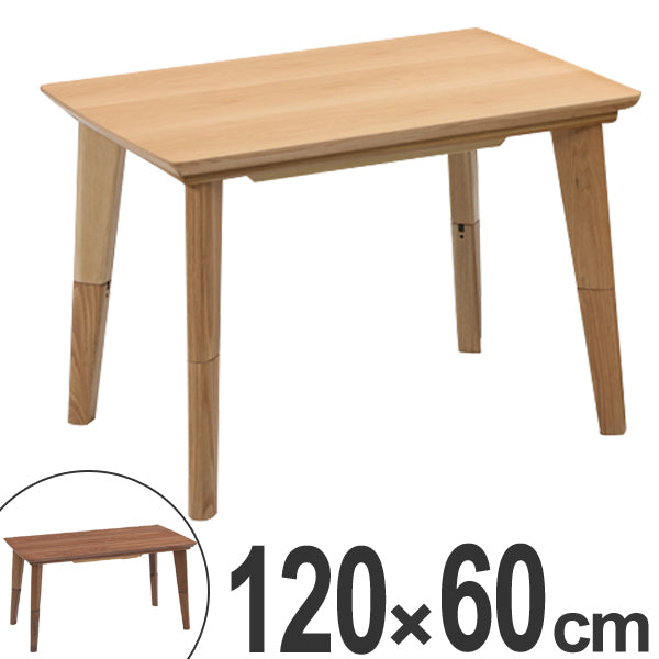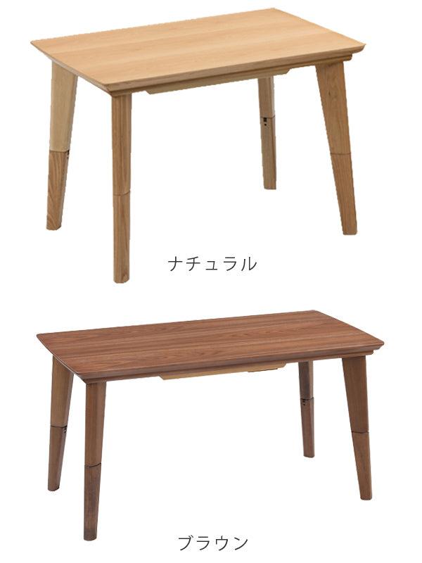 天然木を突板に使用した高さ2段階調節可能なこたつテーブルです。先細りの丸脚が全体をスッキリと見せてくれるのであらゆるお部屋にマッチするシンプルなデザインです。天板幅は120cmタイプです。
