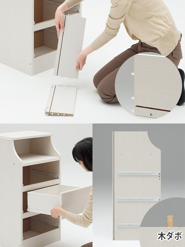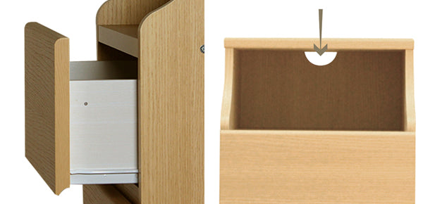 引出しは工具不要で、簡単に組立てが出来るオリジナルパーツを採用しています。木ダボや引出しレールなど細かい部品は、工場で取り付け済みです。また、背面に部品名が印字されているので、どこの部分か一目瞭然です。