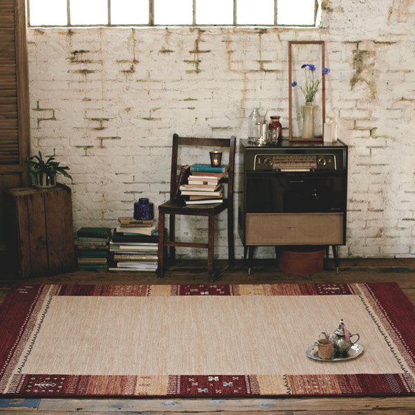 落ち着きのあるレッド、グレーをメインにエスニックテイストの柄が印象的なデザインのラグです。モダンテイストやインダストリアルテイストにもよく合い、インテリアに軽やかさを加えてくれます。