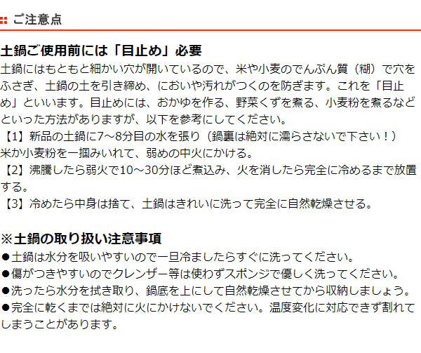 ●土鍋は水分を吸いやすいので一旦冷ましたらすぐに洗ってください。