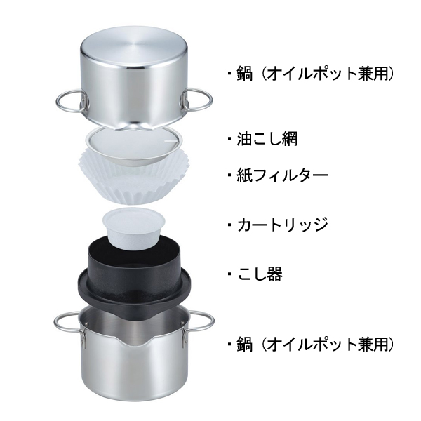 | 内容量 | 鍋×2、油こし網、紙フィルター、活性炭カートリッジ、こし器 鍋1個あたり:0.6L(適正容量) こし器:0.8L(満水容量) |