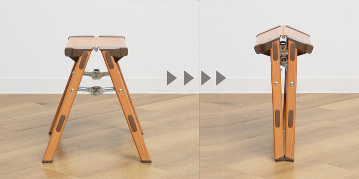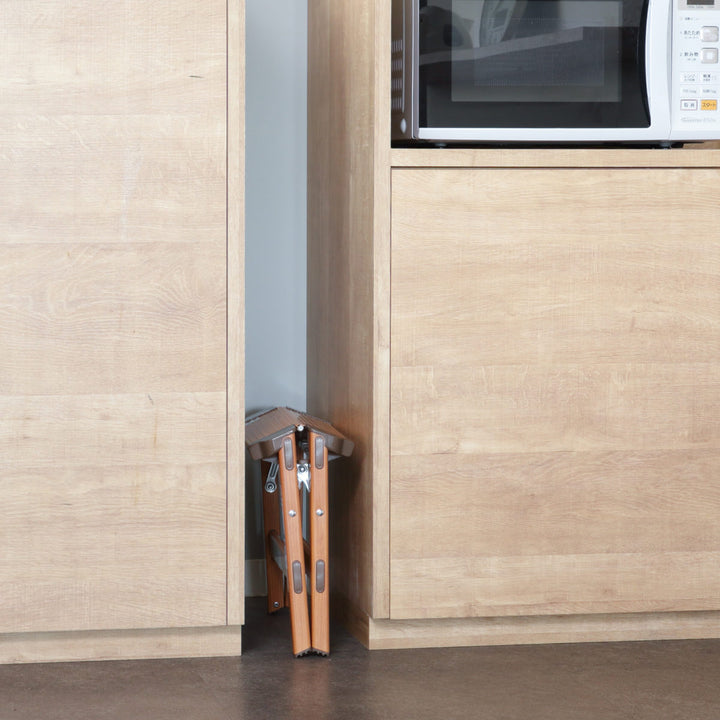 木製のような見た目で、実は軽くて丈夫なアルミ製です。日常の様々なシーンで使用する脚立を、必要な時にサッと運んで気軽にお使いいただけます。