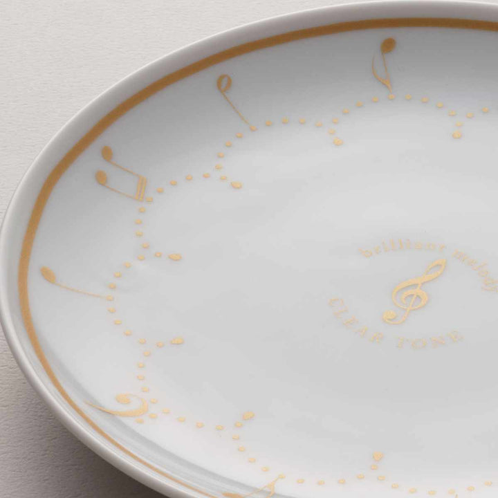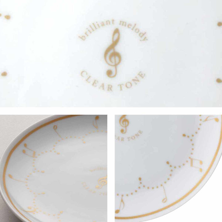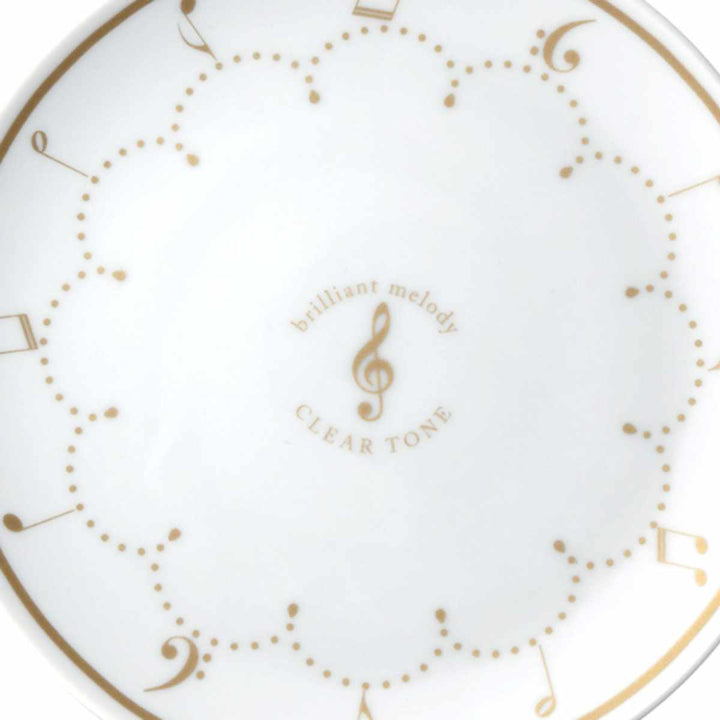 キラリと輝くアンティークゴールドの記号や音符が散りばめられた、リズミカルなデザインです。光が当たるとゴールド部分がキラっと輝きます。磁器製で艶のある上品な質感です。