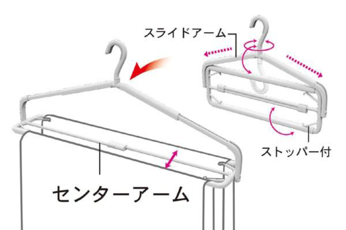 | 備考 | ※ポール径3.2cm以下のパイプハンガーや物干しでご使用ください。 ※センターアームは補強用の部品ですのでセンターアームのみに洗濯物をかけないようお願いします。 |