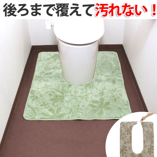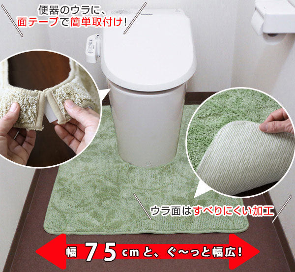 幅75cmのワイドサイズのトイレマットで、トイレの床を広く覆うから、尿はね・汚れ・臭いなどから守ってくれます。また、裏面は滑りにくい加工を施しているので、マットがズレにくいです。
