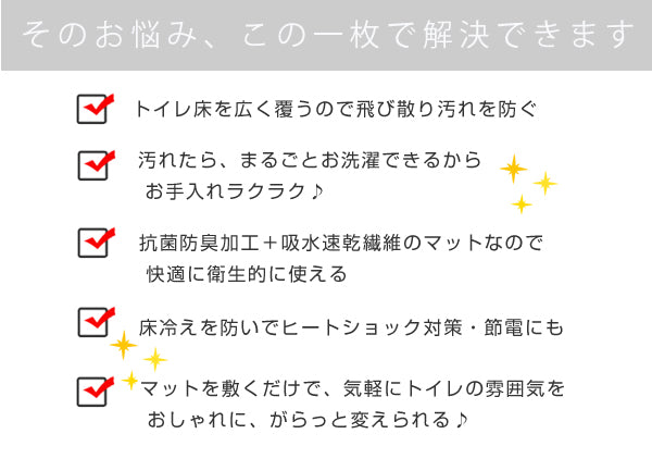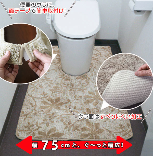 幅75cmのワイドサイズのトイレマットで、トイレの床を広く覆うから、尿はね・汚れ・臭いなどから守ってくれます。また、裏面は滑りにくい加工を施しているので、マットがズレにくいです。