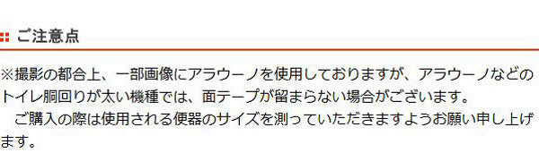 | 備考 | ※撮影の都合上、一部画像にアラウーノを使用しておりますが、アラウーノなどのトイレ胴回りが太い機種では、面テープが留まらない場合がございます。 ※ご購入の際は使用される便器のサイズを測っていただきますようお願い申し上げます。 |