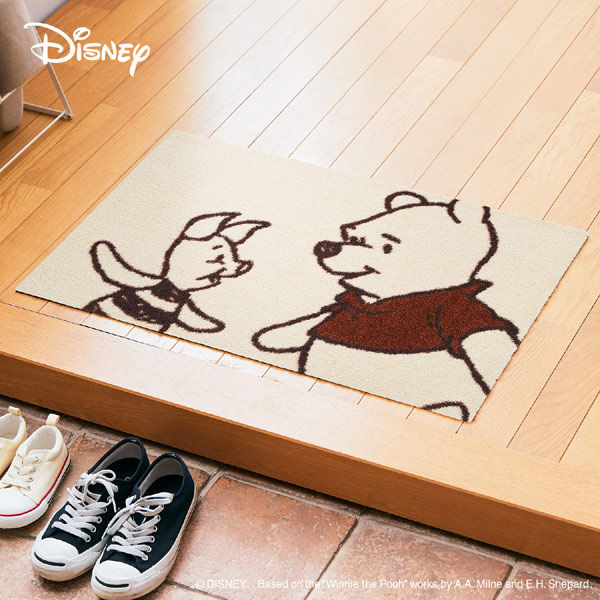 くまのプーさんと仲良しのピグレットの、手描き風のデザインの玄関マットです。シンプルだけどどこかお洒落で温かみのある色使いは、床との相性も抜群です。玄関マットとしてはもちろん、お部屋のラグとしても使用できます。