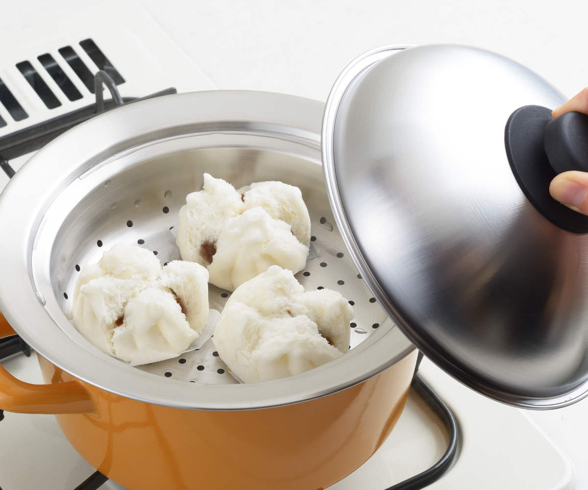 ドーム型の蓋はしっかり加熱蒸気が対流し、ムラなくふっくら蒸しあがります。高さがあるので、茶碗蒸しや大きな肉まんを温める時に便利です。