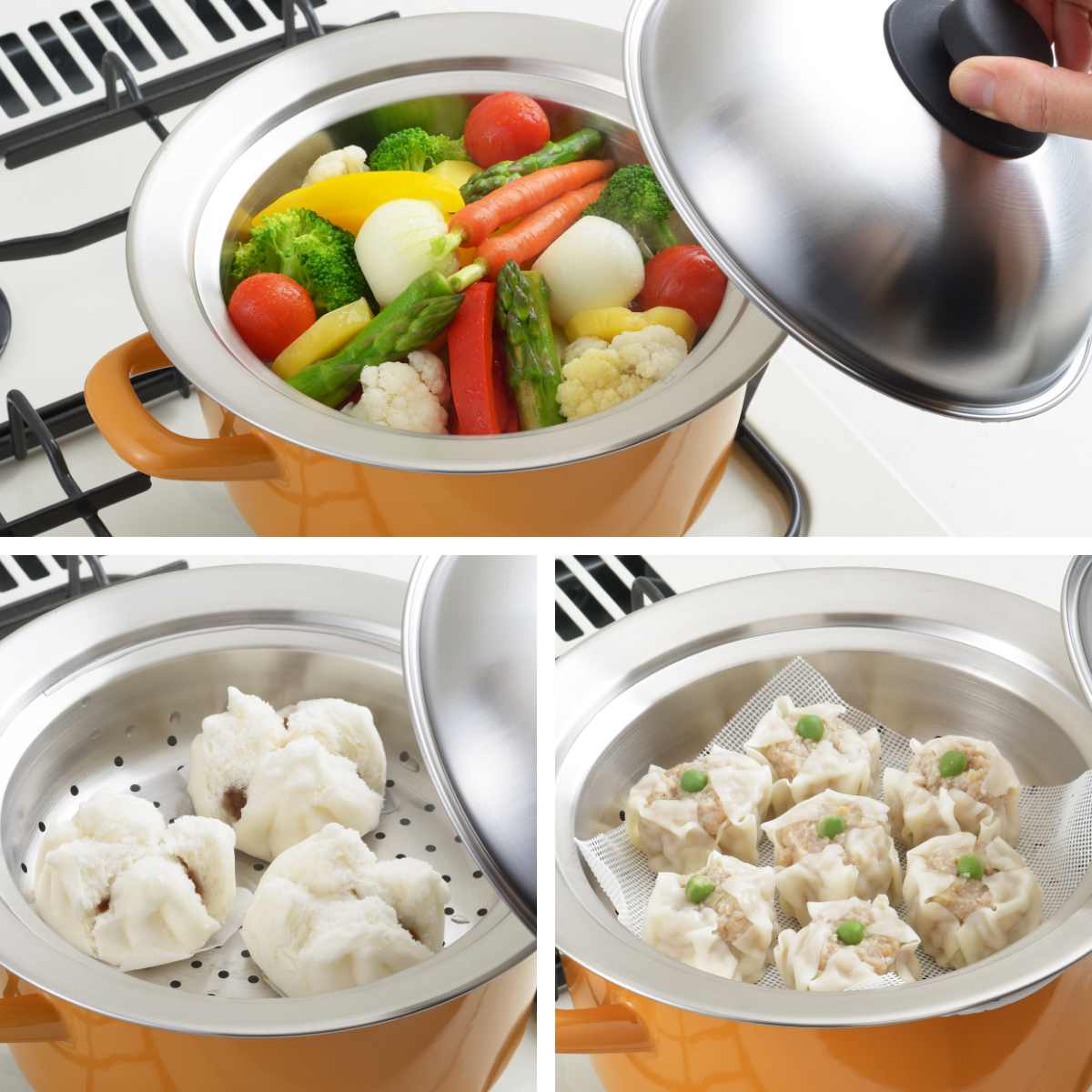 お手持ちの鍋にのせるだけで、蒸し料理が作れるステンレス製の蒸しプレートです。大きな専用蒸し器をわざわざ準備しなくても、手軽に蒸し料理が作れます。プレートと蓋のみなので、簡単に洗うことができ、かさばらず収納できるのもうれしいポイントです。