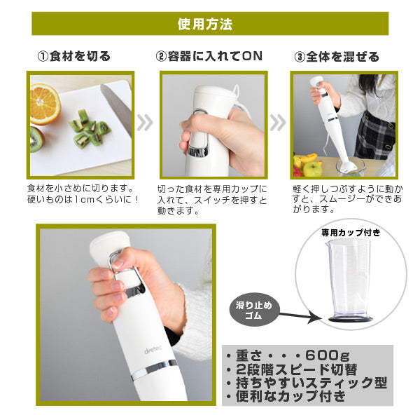 通常とターボモードの2段階でスピード切替ができるハンドブレンダーで、食材に合わせて回転スピードをかえることができます。手の小さい女性でも扱いやすく、持ちやすいスティック型で、持つ部分がくぼんでいるのでしっかりと握れます。便利な専用カップ付きで、滑り止めも付いているので安心して使用できます。ハンドブレンダーの重さは600gです。
