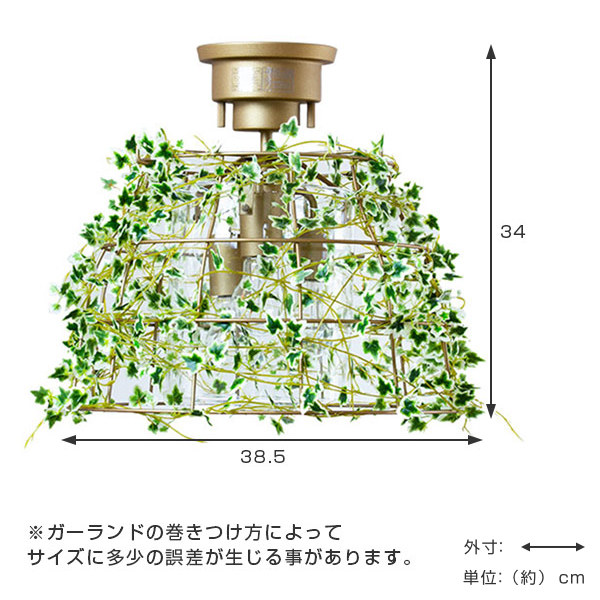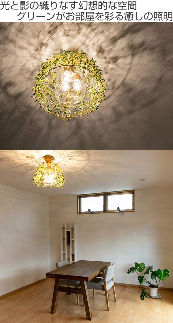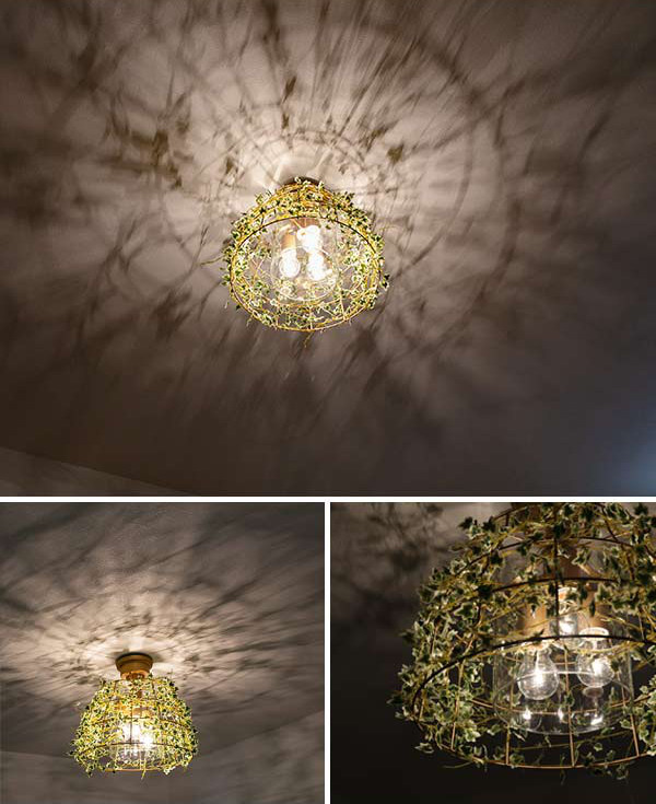 重厚感あるアンティーク風のアイアンシェードに、アイビーのガーランドを巻きつけて使用する、インテリア性の高いデザイン照明器具です。ボタニカルな雰囲気をプラスしお部屋を癒しの空間へ。(天井に直接取り付けるシーリングタイプです。)