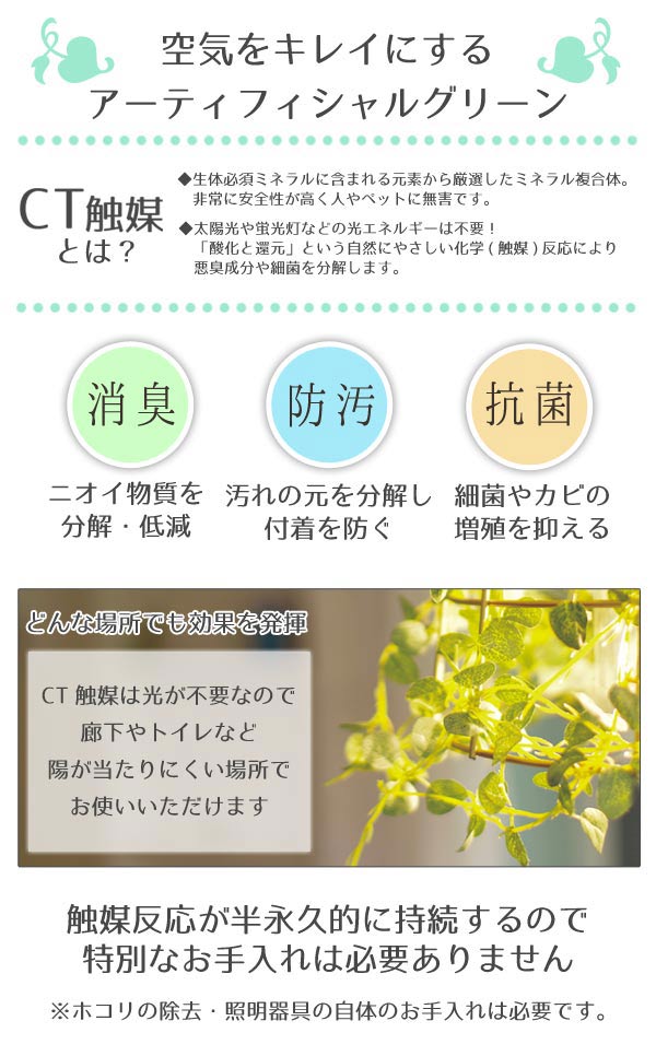 葉にCT触媒加工が施されており、枯れることなく美しい状態を保つことができます。