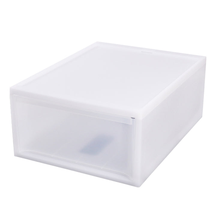 引出しはクリアに近い半透明で、開けなくても中身が分かりやすくなっています。外枠部分は白味の強いやわらかな半透明なので、中身が透けすぎずお部屋の雰囲気を壊しません。