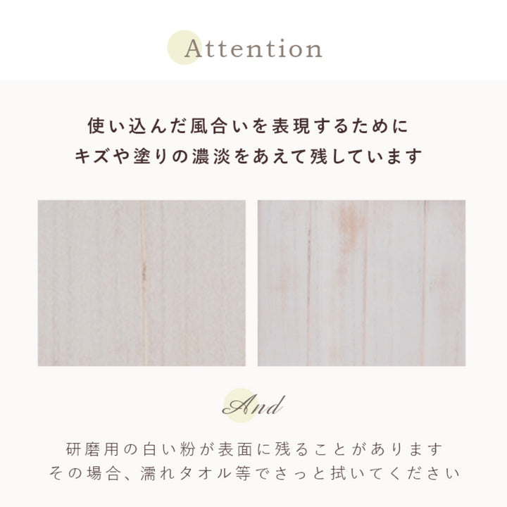木目が透けて見えるアンティークな風合いです。あえて濃淡・かすれのある塗装を施しています。塗装は職人による手作業のため1点1点、多少の個体差がございます。