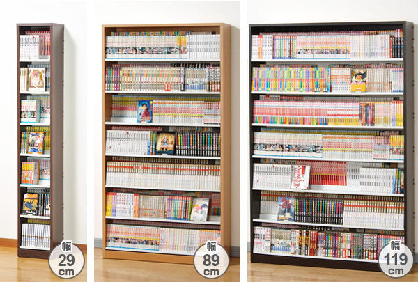 奥行29.5cm×高さ182cmで、幅が異なる3種類のコミックラック。お部屋にあわせてカラーはブラウンとナチュラルの2色からお選びいただけます。奥行と高さが同じだから、収納量にあわせて組み合わせてご使用いただけます。