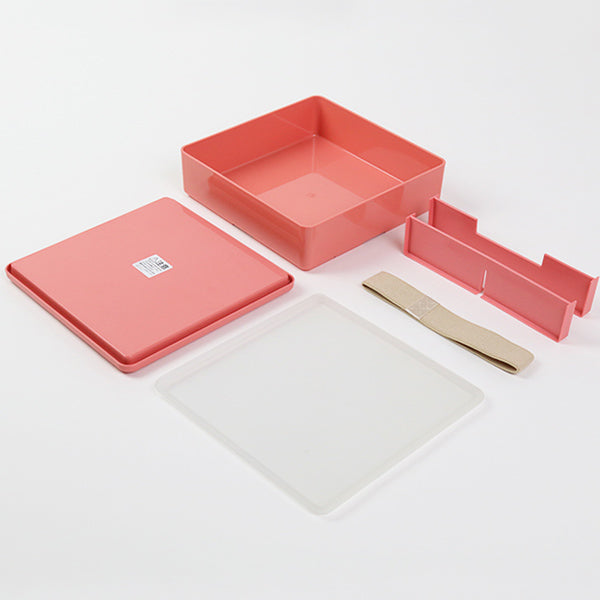 | 材質 | 本体:ABS樹脂(耐熱:120度、耐冷:-20度) 仕切り:ポリプロピレン(耐熱:140度、耐冷:-20度) 保冷ブタ:ABS樹脂(耐熱:60度、耐冷:-20度) 中ブタ:SEBS樹脂可塑性エラストマー(耐熱:120度、耐冷:-60度) ゴムバンド:レーヨン、ポリエステル、ラバー |