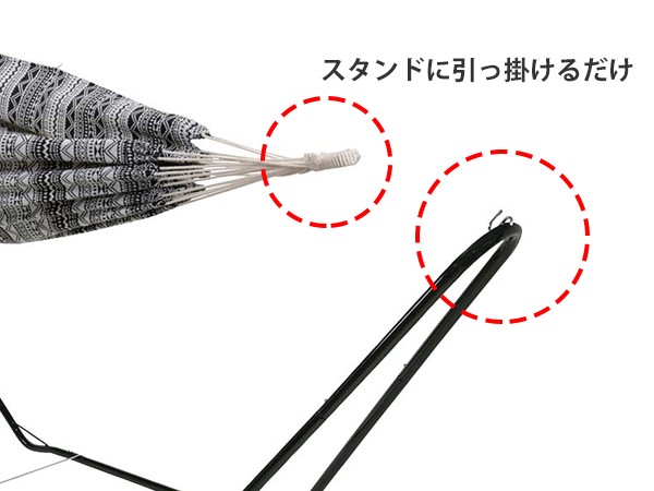 スタンドに引っ掛けるだけで使用できます。紐を結ぶ必要がありません。また好きな場所に移動もできるので日陰やタープの下などいつでも動かせます。