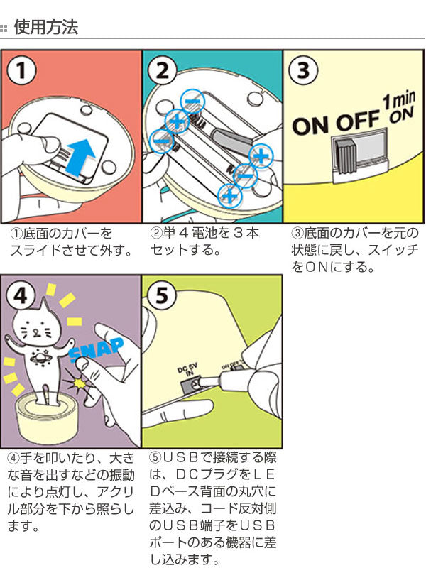 | 備考 | 取扱説明書付き 電源:単4電池3本、USBケーブル 使用回数:約2000回(アルカリ乾電池、1分間点灯スイッチ使用の場合。) ※乾電池は付属しておりません。 ※明るい場所でも振動や音を感知すると点灯します。 |