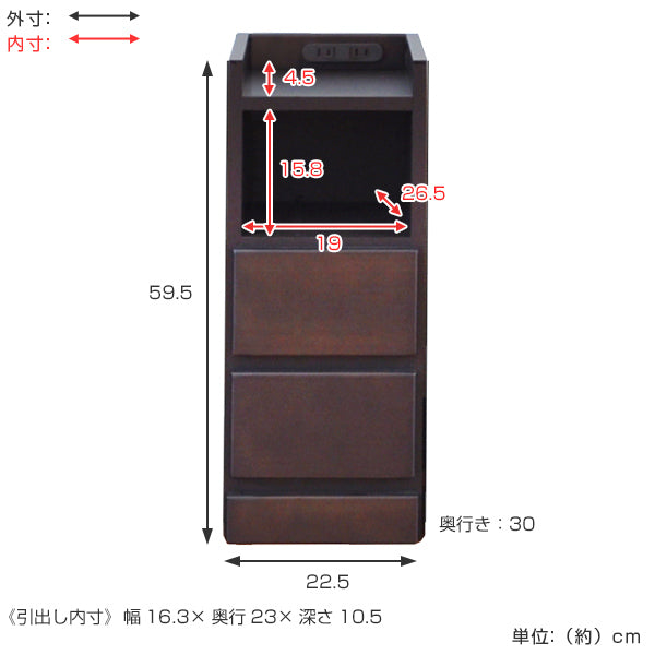 | サイズ | 約 幅22.5×奥行30×高さ59.5(cm) 引出し内寸:約 幅16.3×奥行23×高さ10.5(cm) |