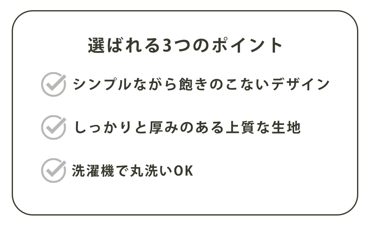 ほどよい厚みのある上質な生地のカバーです。ほつれにくく丈夫で、踏み心地もバツグンです。また、清潔感のあるモノトーン基調の色合いなので、季節を問わずお使いいただけます。