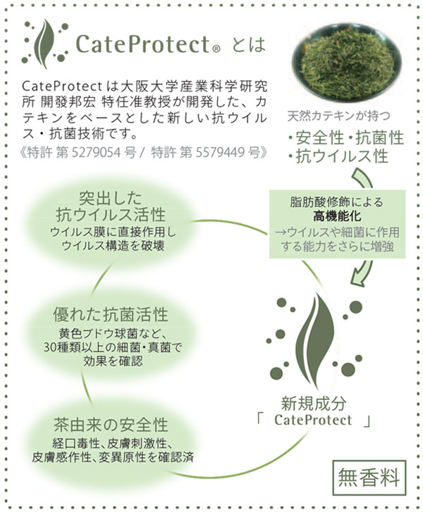 | 成分 | 主成分:カテプロテクト(カテキン脂肪酸エステル)・DPG・水・クエン酸塩 ヒドロキシプロピルシクロデキストリン・香料 |