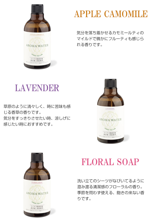 | 備考 | ※界面活性化剤不使用 ※このアロマウォーターは加湿器のミストでカテプロテクトを噴射するため、必ず超音波加湿器でご使用ください。 |
