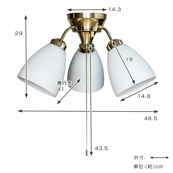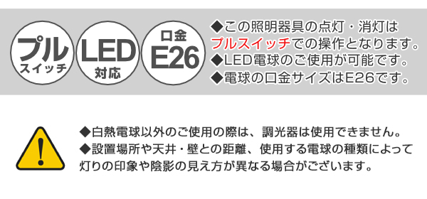 | 注意事項 | 使用電球:E26 14W LED電球(電球色)×3 ※ライトコントロール(調光器)との併用は出来ません。(全光状態でもご使用いただけません。) |