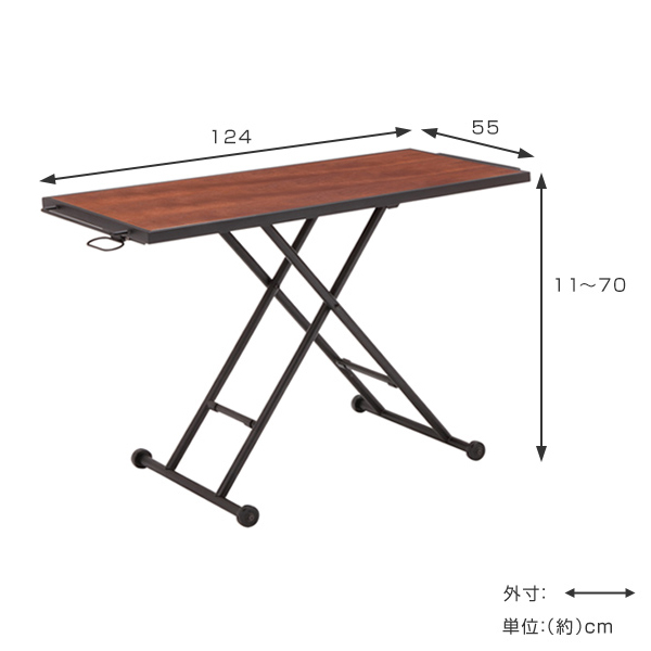 | サイズ | 本体:約 幅124×奥行55×高さ11〜70(cm) 天板:幅110.6×奥行50.6(cm) 天板木部有効:約 幅100×奥行48(cm) |