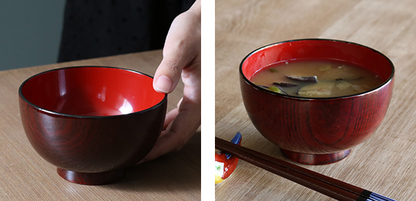 使うほどに艶が増す漆塗りで仕上げ、漆塗りのツヤと朱色の美しさが際立った汁椀です。漆塗りは水かお湯、気になる場合でも少量の洗剤のみで汚れを落とすことができる洗いやすさが魅力。汚れも付きにくく扱いやすくなっています。