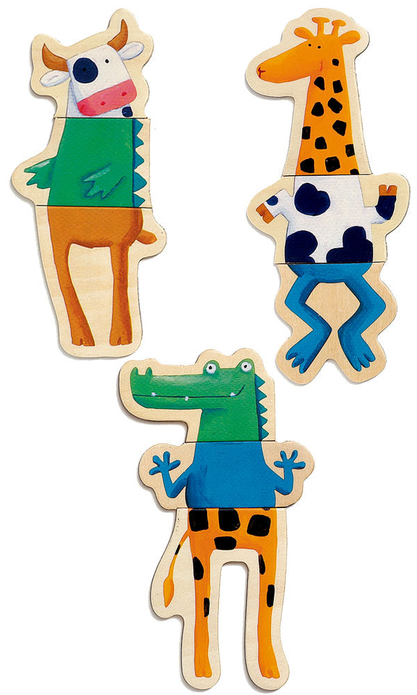 ●8種類の動物たちが頭、胴、足のパーツにわかれている木製のパズルです。