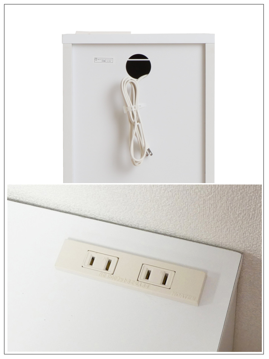 天板後方には2口コンセント付き(1500w)です。キッチンでは電気ケトルやコーヒーメーカーを、洗面所ではドライヤーやシェーバーなどを使う時に活躍します。
