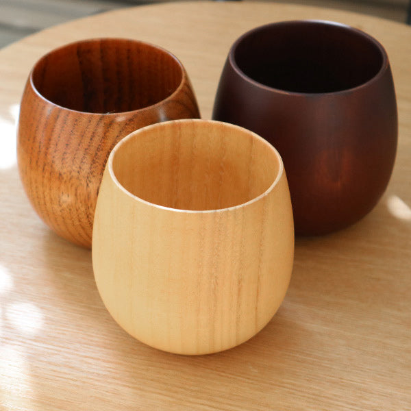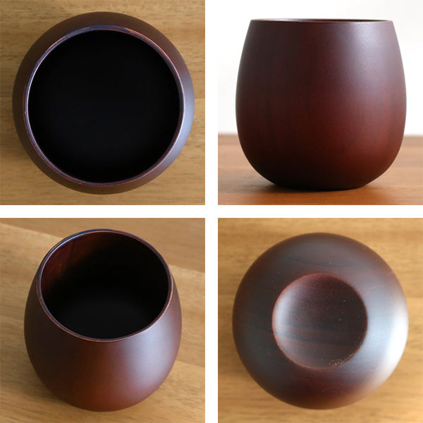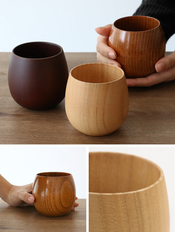 木製のカップは軽くて扱いやすい上、熱伝導率が低いので、カップに熱が伝わりにくく、熱い飲み物を入れても安心です。和・洋どちらにも合わせやすく、湯のみとしてだけでなく、ワインカップとしても最適です。