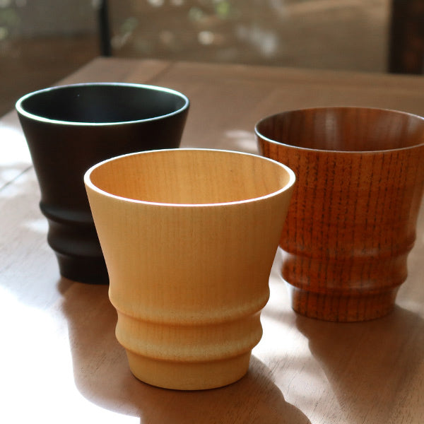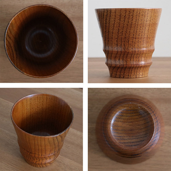 カップの下部分に凹凸があり持ちやすいデザインの木製カップです。選び抜かれた木材を熟練された木地師によって丁寧にろくろで仕上げられた木の器。天然木を使用したカップは、手に優しく、口当たりも滑らかです。天然木ならではの1点1点違う木目や色味をお楽しみください。
