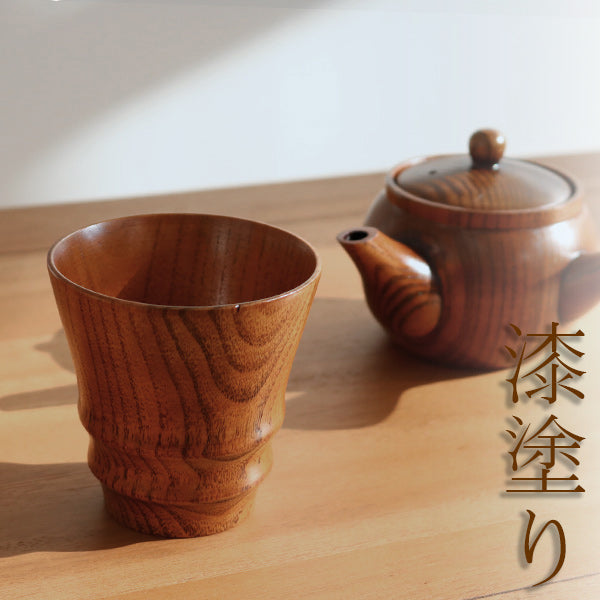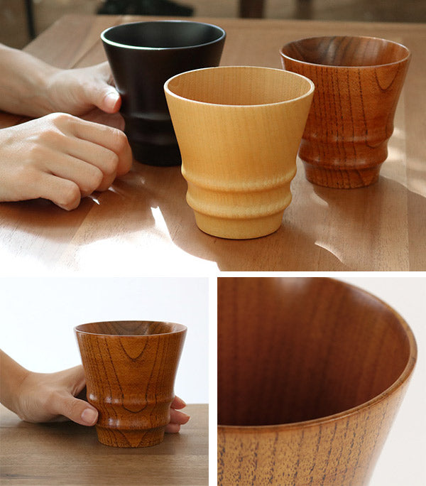 木製のカップは軽くて扱いやすい上、熱伝導率が低いので、カップに熱が伝わりにくく、熱い飲み物を入れても安心です。和・洋どちらにも合わせやすく、湯のみとしてだけでなく、お酒用カップとしても最適です。