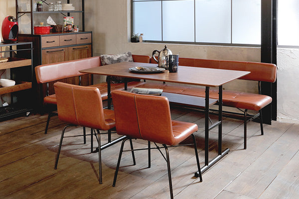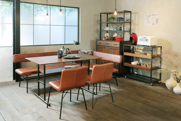 存在感のある赤茶色の合皮は使うほどに質感が増していくため、ヴィンテージ調のお部屋作りにはピッタリです。ブラックスチールとの組み合わせが絶妙なレトロ感を醸し出します。