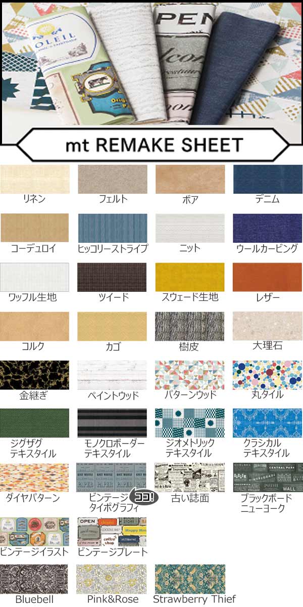 mtREMAKESHEETシリーズリメイクシートにはシンプルな柄からビンテージスタイルの柄まで、いろいろな種類があります。きっと好みの柄、お部屋に合った柄が見つかります!いろんな柄を組み合わせても素敵な空間ができあがりそうです♪