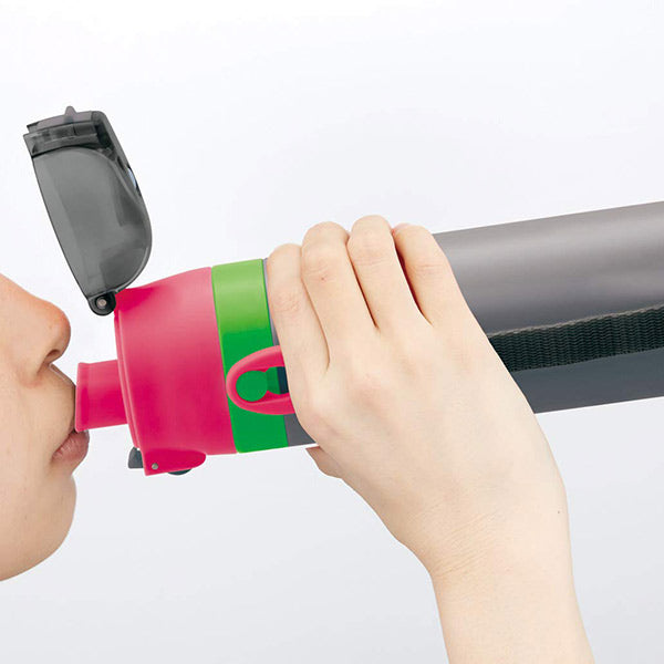 ワンプッシュボタン付きのフタに付け替えると、直飲みタイプの水筒になります。直飲みタイプは、飲んでいる時にフタが戻ってこないキャップロック設計なので、安心して飲み物を飲むことができます。