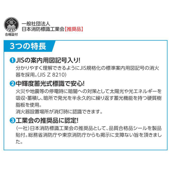 電気が消えても長時間光る蓄光タイプの消火器標識プレート