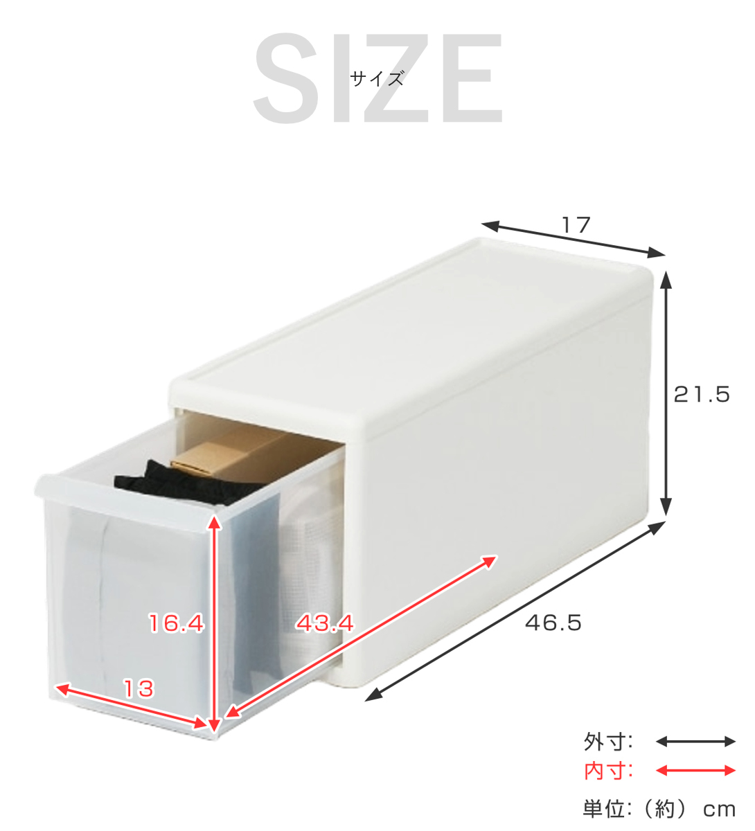 | サイズ | 約 幅17×奥行46.5×高さ21.5(cm) 引き出し内寸:約 幅13×奥行43.4×高さ16.4(cm) |